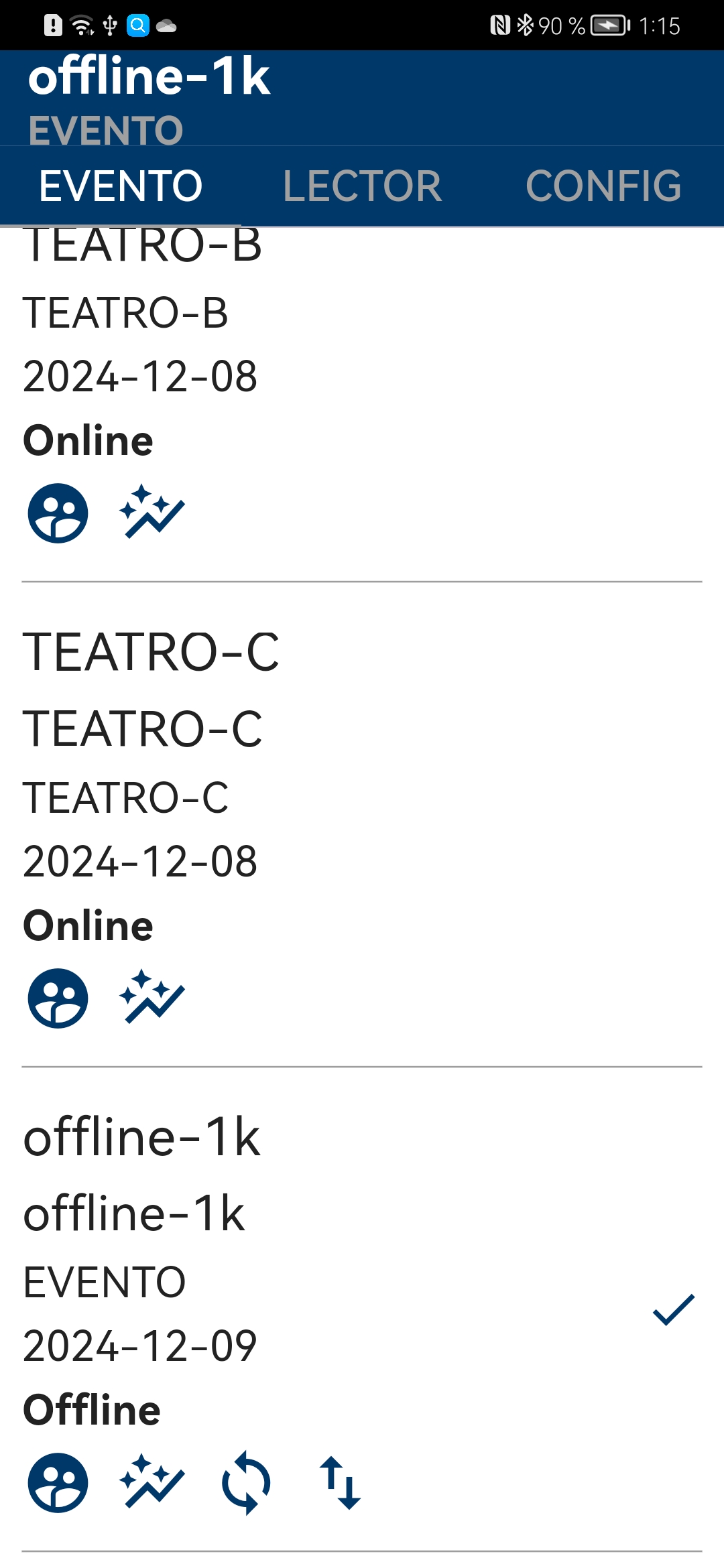 QRAcceso online es la nueva APP de control de entrada y salida ONLINE y OFFLINE de Abarcando, SL con usuarios de tipo LECTOR restringido y cuenta de ADMINISTRADOR. Esos 2 tipos de cuentas ofrecen en la APP opciones diferenciadas al logarse. En la imagen de la derecha mostramos una captura para el caso de un usuario administrador con 2 eventos online y un evento offline: